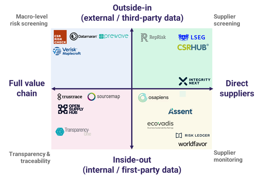 Digital tools can certainly support due diligence processes, notably through their ability to collect and analyse data at scale. Yet they also have shortcomings, depending on their scope (from full value chain to direct business partners) and the data used (from primary data collected from suppliers to secondary data collected through web scraping and data mining). No tool is perfect, and it is important to make targeted choices depending on your specific objectives.
